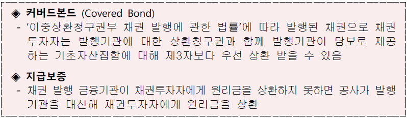 이번 발행은 지방은행이 공사의 지급보증을 통해 신용등급을 높여(AA+→ AAA) 커버드본드를 발행한 첫 사례로 BNK경남은행은 공사의 지급보증을 통해 5년물(1500억원, 3.04%) 커버드본드를 동일만기 은행채(AA+)* 대비 약 0.10%포인트 낮은 수준으로 발행해 주택담보대출 재원 조달비용을 절감했다.